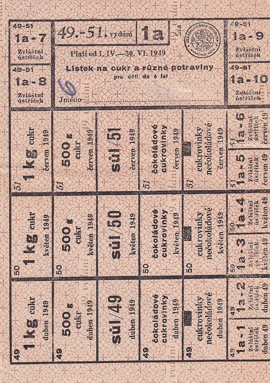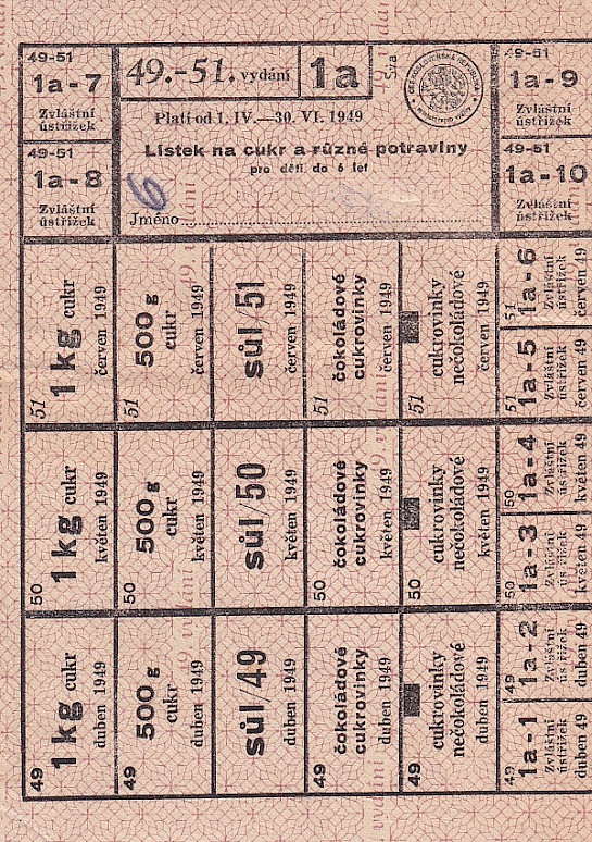 Lístek na cukr a různé potraviny pro děti do 6 let 49.-51./1a 1.IV.-30.VI. 1949