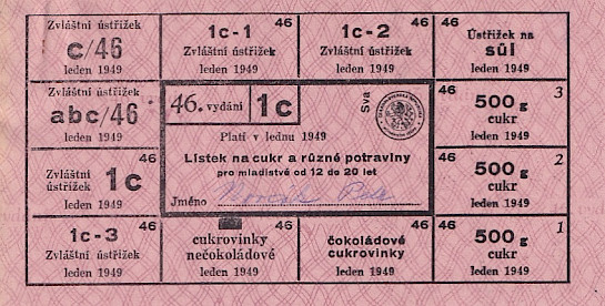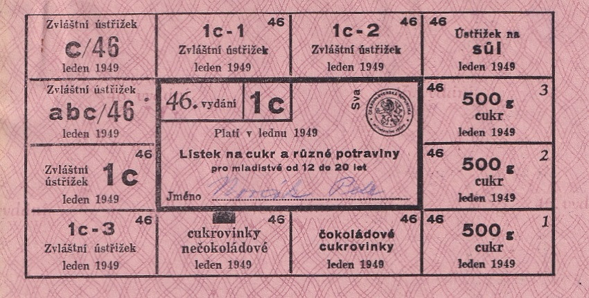 Lístek na cukr a různé potraviny pro mladistvé od 12 do 20 let 46./1c Leden 1949