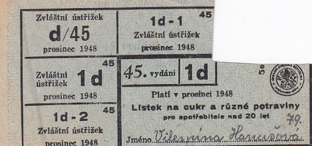 Lístek na cukr a různé potraviny pro spotřebitele nad 20 let 45./1d Prosinec 1948