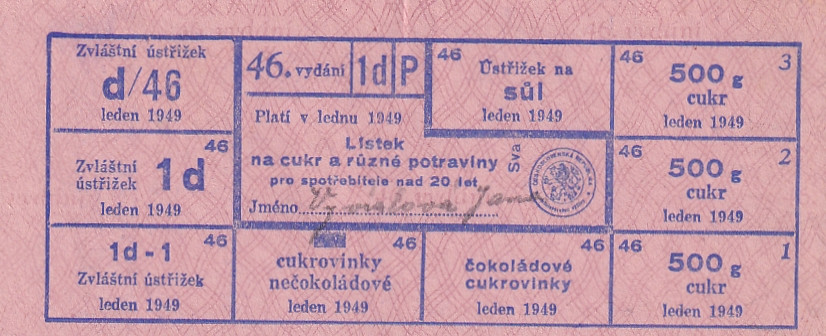 Lístek na cukr a různé potraviny pro spotřebitele nad 20 let 46./1d/P Leden 1949