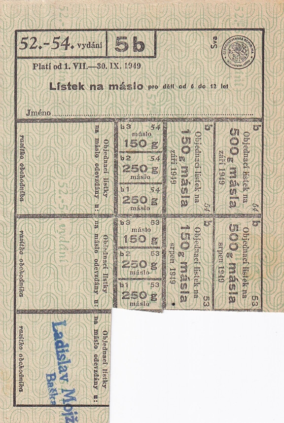 Lístek na máslo pro děti od 6 do 12 let 52.-54./5b 1.VII.-30.IX.1949