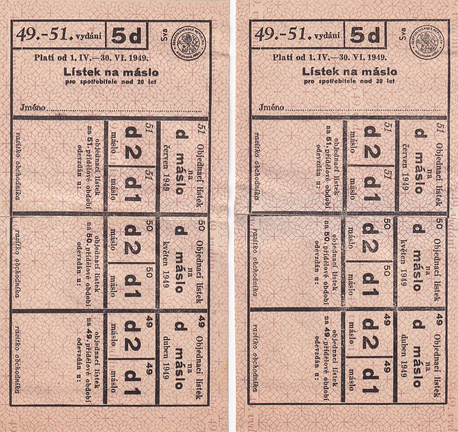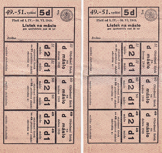 Lístek na máslo pro spotřebitele nad 20 let 49.-51./5d 1.IV.-30.VI.1949 , dva lístky