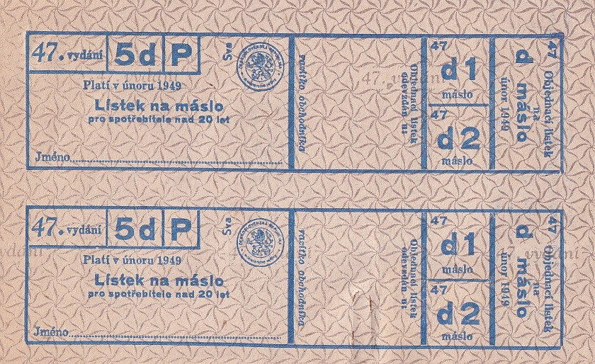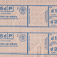 Lístek na máslo pro spotřebitele nad 20 let let 47./5d/P Únor 1949 , dva lístky