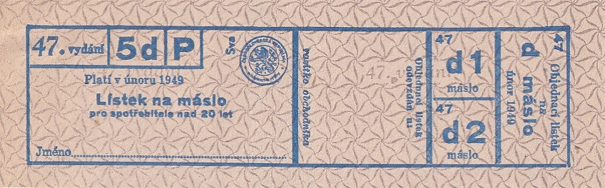 Lístek na máslo pro spotřebitele nad 20 let let 47./5d/P Únor 1949