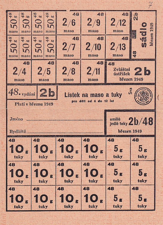 Lístek na maso a tuky pro děti od 6 do12 let 48./2b Březen 1949