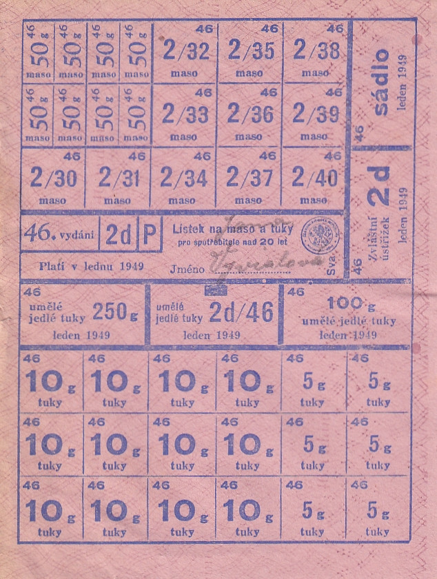 Lístek na maso a tuky pro spotřebitele nad 20 let 46./2d/P Leden 1949