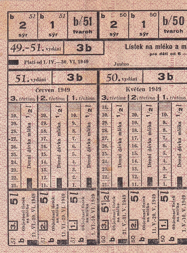 Lístek na mléko a mléčné výrobky pro děti od 6 - 12 let 49.-51./3b 1.IV.-30.VI. 1949