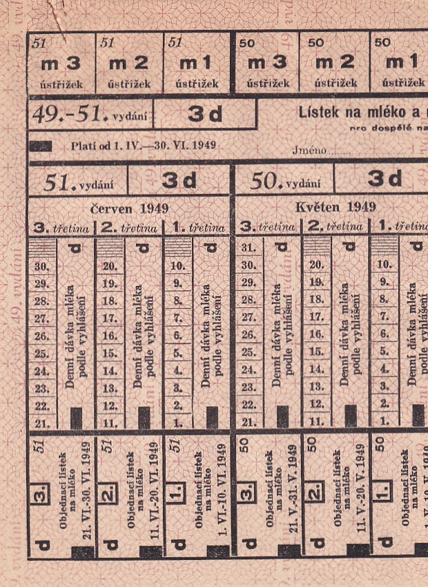 Lístek na mléko a mléčné výrobky pro dospělé nad 20 let 49.-51./3d 1.IV.-30.VI.1949