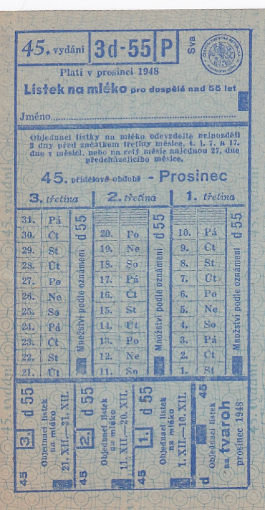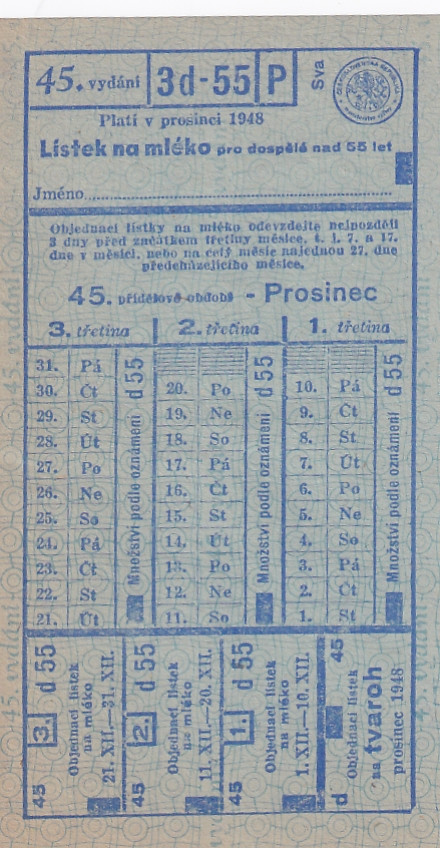 Lístek na mléko pro dospělé nad 55 let 45./3d-55/P Prosinec 1948