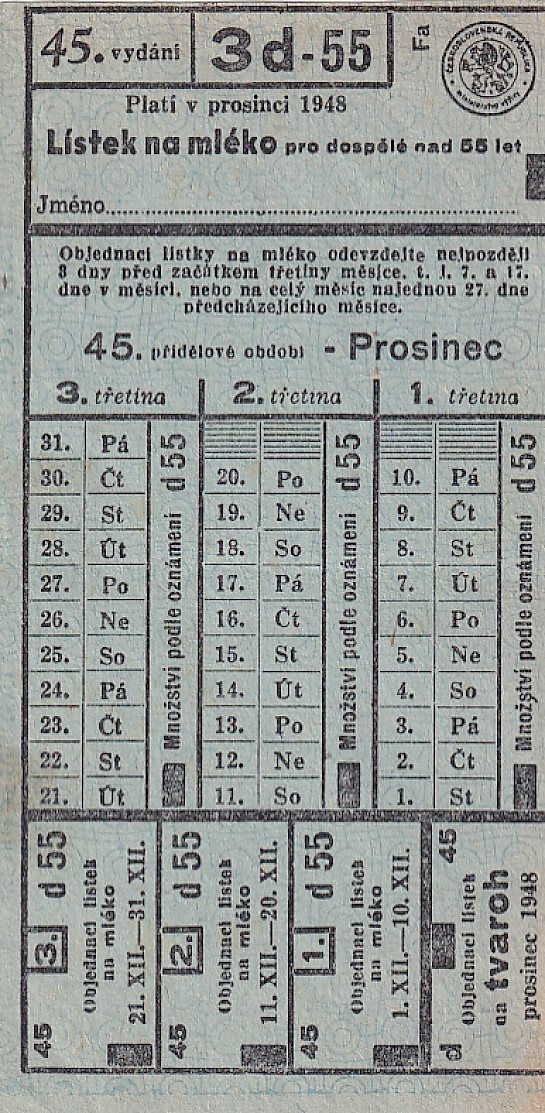 Lístek na mléko pro dospělé nad 55 let 45./3d-55 Prosinec 1948
