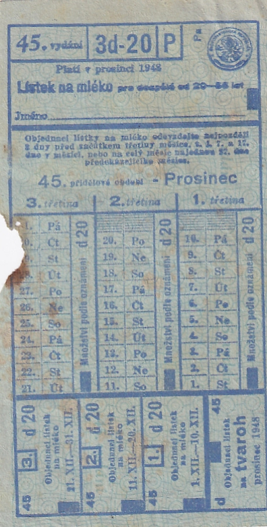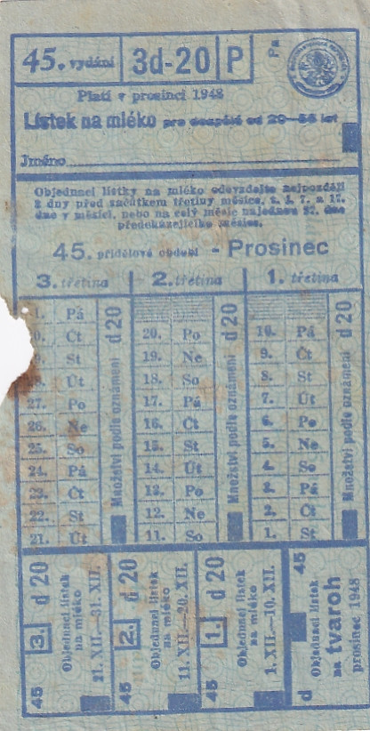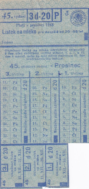 Lístek na mléko pro dospělé od 20 - 55 let 45./3d-20/P Prosinec 1948