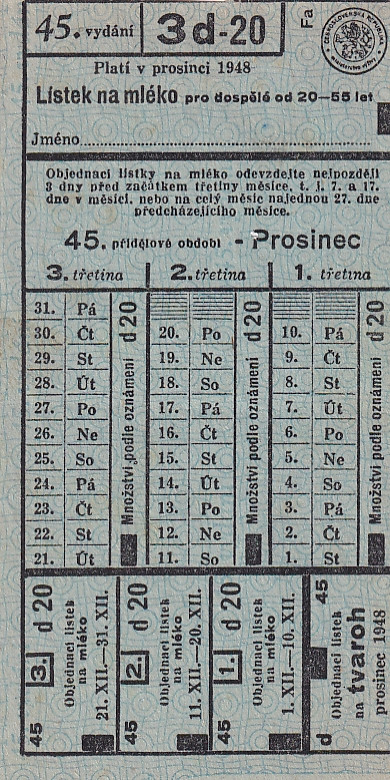 Lístek na mléko pro dospělé od 20 - 55 let 45./3d-20 Prosinec 1948
