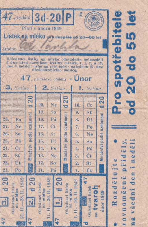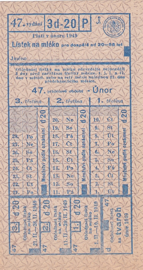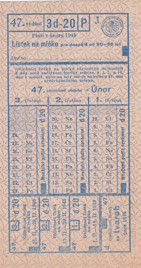 Lístek na mléko pro dospělé od 20-55 let 47./3d-20/P Únor 1949