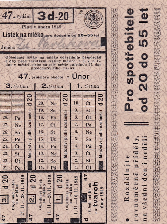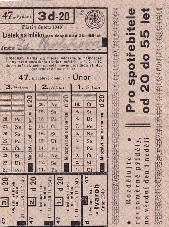 Lístek na mléko pro dospělé od 20-55 let 47./3d-20 Únor 1949