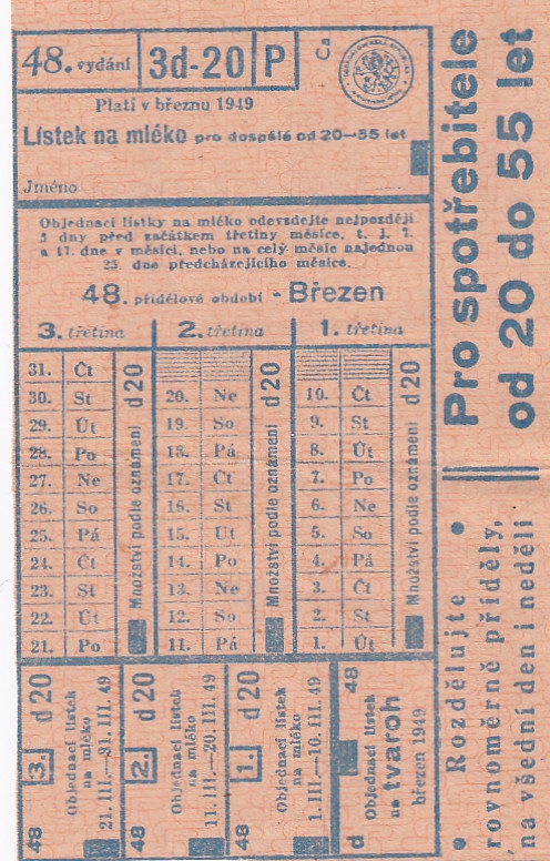 Lístek na mléko pro dospělé od 20-55 let 48./3d-20/P Březen 1949