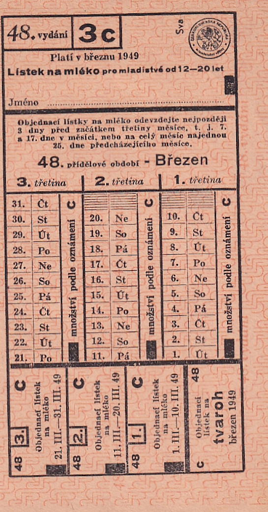 Lístek na mléko pro mladistvé od 12-20 let 48./3c Březen 1949