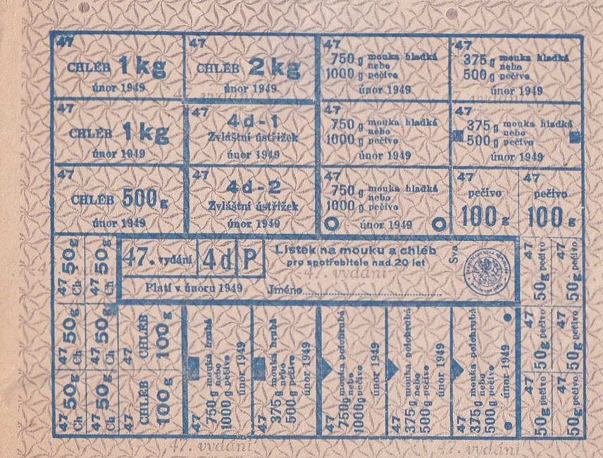 Lístek na mouku a chléb pro spotřebitele nad 20 let let 47./4d/P Únor 1949