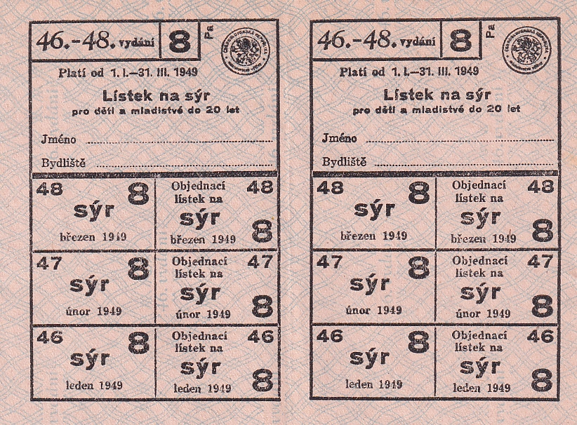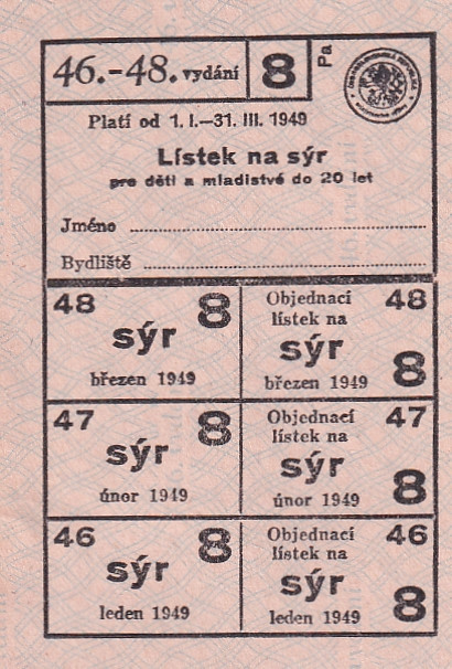 Lístek na sýr pro děti a mladistvé do 20 let 46.-48./8 1.I.-31.III. 1949