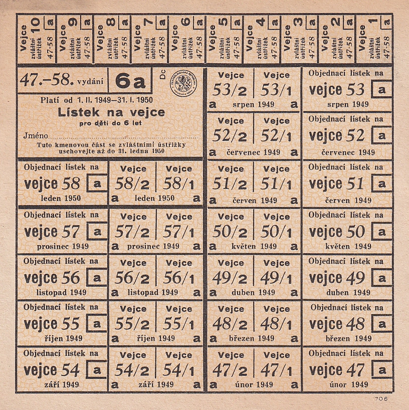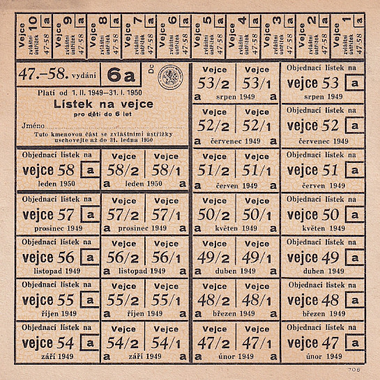 Lístek na vejce pro děti do 6 let 47.-58./6a 1.II.1949-31.I.1950