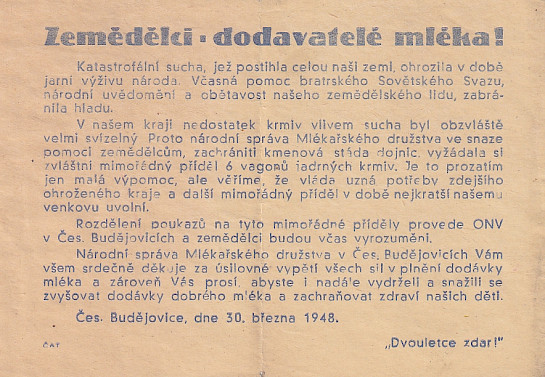 Propaganda letáček-Zemědělci,dodavatelé mléka-Rozdělení poukazů-Dvouletce zdar-30.3.1948
