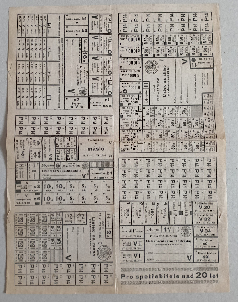 Spojený lístek pro spotřebitele nad 20 let na máslo,mléko,chléb,maso,cukr 14./1/V/2A/6/11/16A 27.V.-23.VI.1946