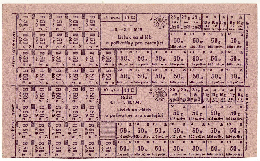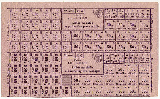 Lístek na chléb a poživatiny pro cestující 10./11C 4.II.-3.III.1946 , nekompletní