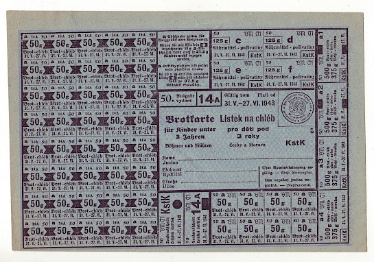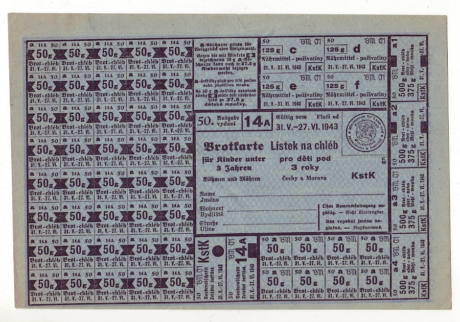 Lístek na chléb pro děti pod 3 roky 50/14A 31.V. - 27.VI. 1943