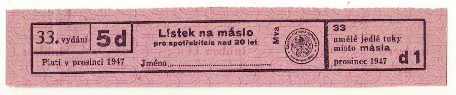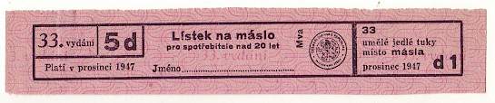 Lístek na máslo pro spotřebitele nad 20 let 33/5d prosinec 1947