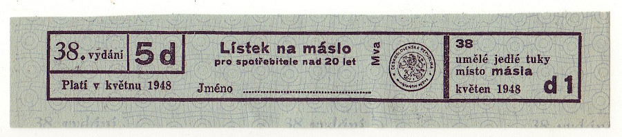 Lístek na máslo pro spotřebitele nad 20 let 38./5d květen 1948
