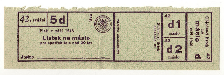 Lístek na máslo pro spotřebitele nad 20 let 42./5d září 1948