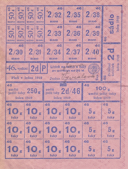 Lístek na maso a tuky pro spotřebitele nad 20 let 46./2d/P Leden 1949