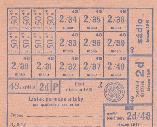 Lístek na maso a tuky pro spotřebitele nad 20 let 48./2d/P Březen 1949