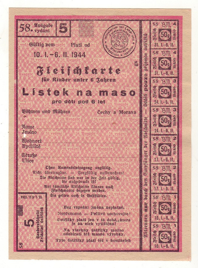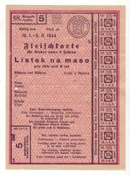 Lístek na maso pro děti pod 6 let 58/5 10.I.- 6.II.1944