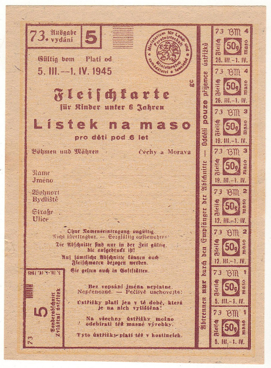 Lístek na maso pro děti pod 6 let 73/5 5.III.-1.IV.1945