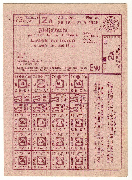 Lístek na maso pro spotřebitele nad 18 let 75/2A 30.IV.-27.V.1945