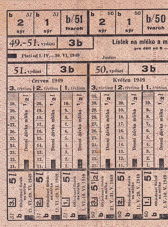 Lístek na mléko a mléčné výrobky pro děti od 6 - 12 let 49.-51./3b 1.IV.-30.VI. 1949