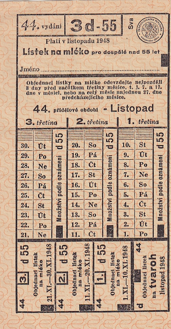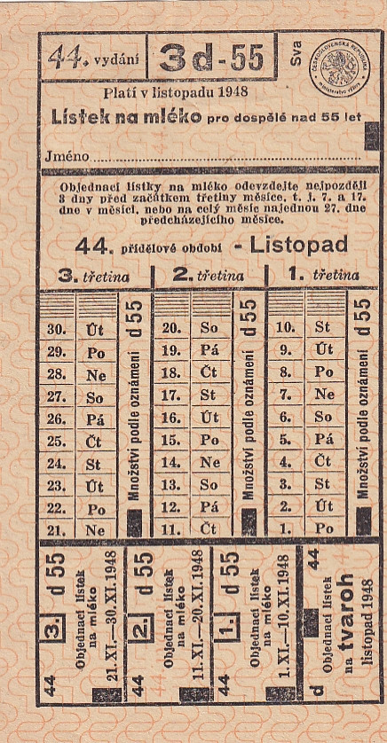 Lístek na mléko pro dospělé nad 55 let 44/3d-55 listopad 1948