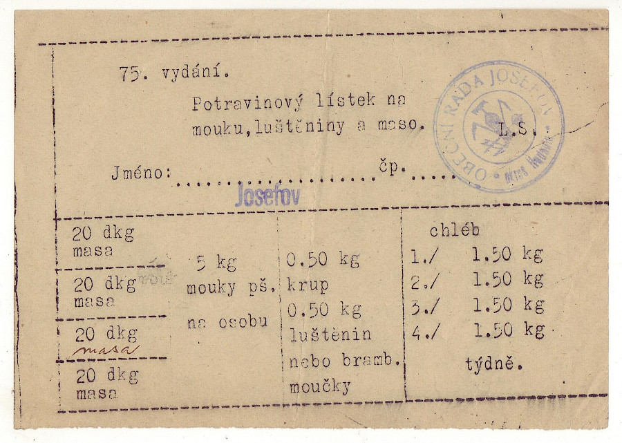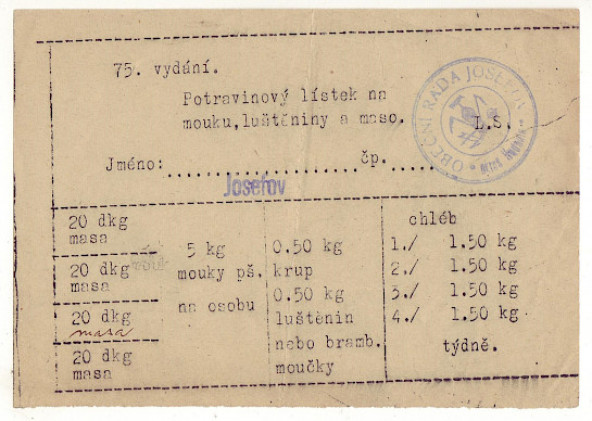 Lístek na mouku,luštěniny a maso 75.vydání 1945 , provizorní , obecní rada Josefov , okres Hodonín
