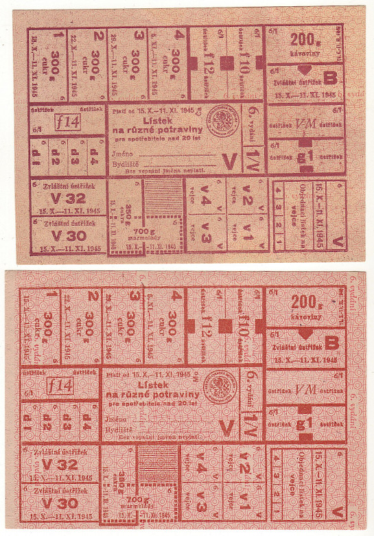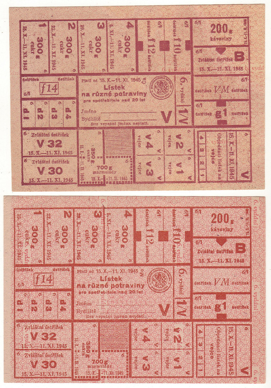 2 x Lístek na různé potraviny pro spotřebitele nad 20 let 6./1/V 15.X.-11.XI.1945 , různé tiskové desky