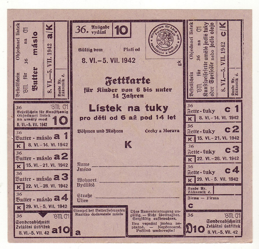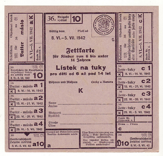 Lístek na tuky pro děti od 6 až pod 14 let 36/10 8.VI. - 5.VII. 1942