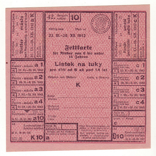Lístek na tuky pro děti od 6 až pod 14 let 42/10 23.XI. - 20.XII. 1942