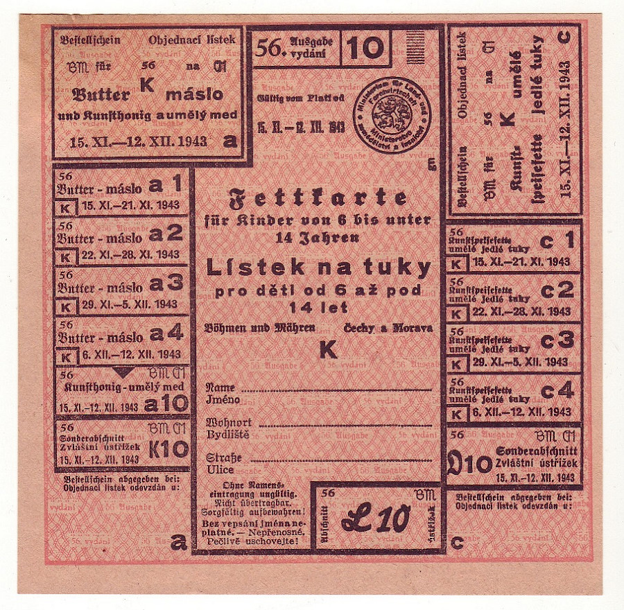 Lístek na tuky pro děti od 6 až pod 14 let 56/10 15.XI. - 12.XII. 1943