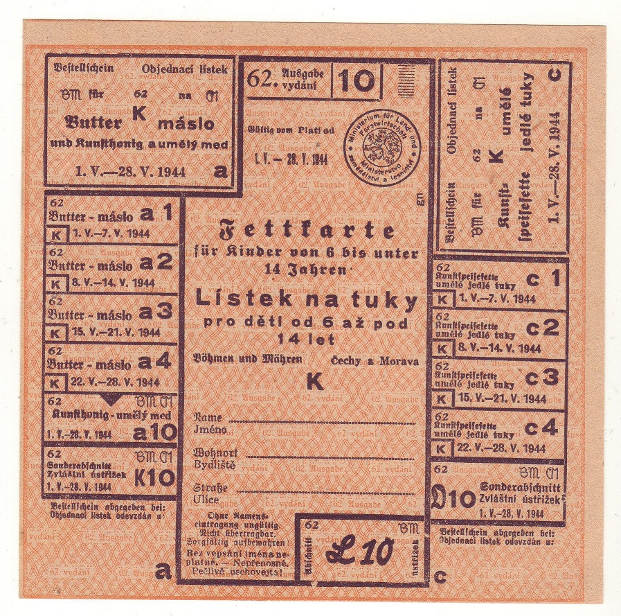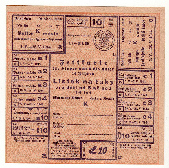 Lístek na tuky pro děti od 6 až pod 14 let 62/10 1.V. - 28.V. 1944
