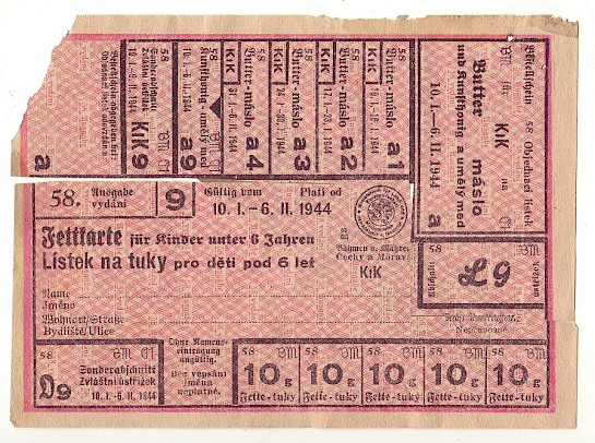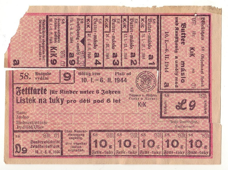 Lístek na tuky pro děti pod 6 let 58/9 10.I.- 6.II.1944 , kompletní ale slepovaný .