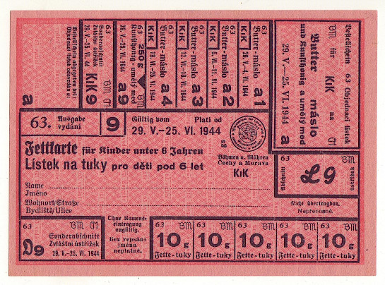 Lístek na tuky pro děti pod 6 let 63/9 29.V - 25.VI. 1944