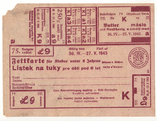 Lístek na tuky pro děti pod 6 let 75/L9 30.IV.-27.V.1945