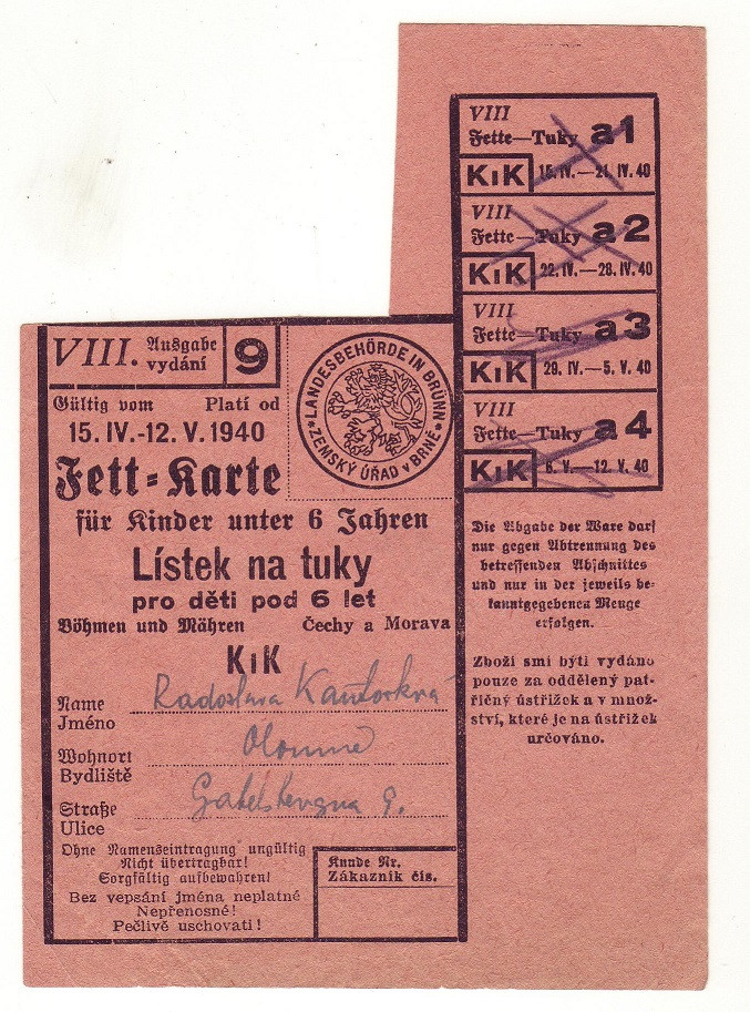 Lístek na tuky pro děti pod 6 let VIII/9 - 15.IV. - 12.V. 1940 , bez přihlašovací části