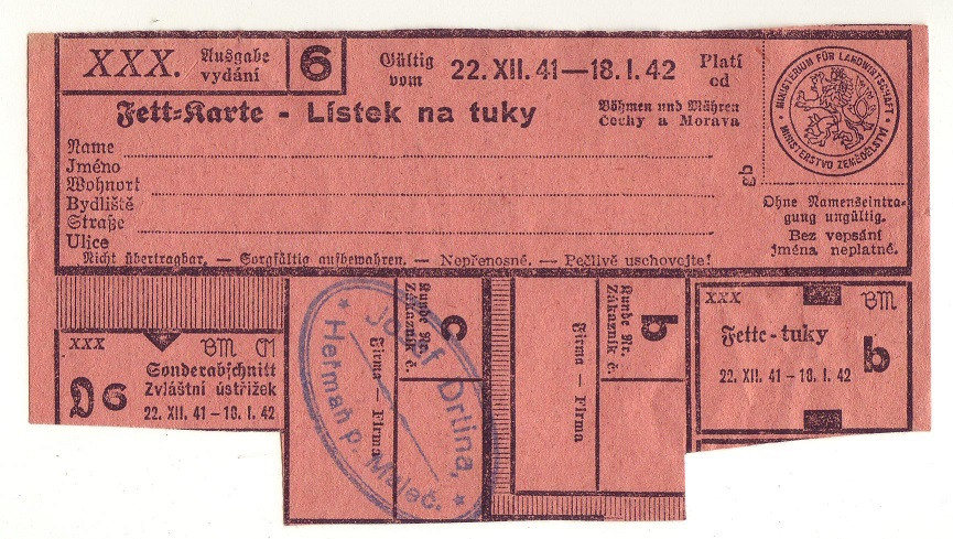 Lístek na tuky XXX/6 22.XII.1941 - 18.I.1942 , částečný lístek