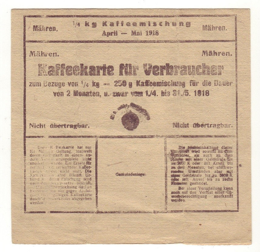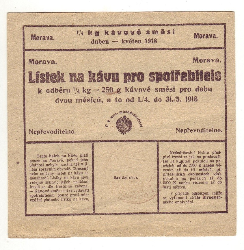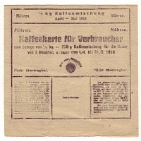 Lístek na kávu pro spotřebitele od 1.4. do 31.5. 1918 , oboustranný česko-německý