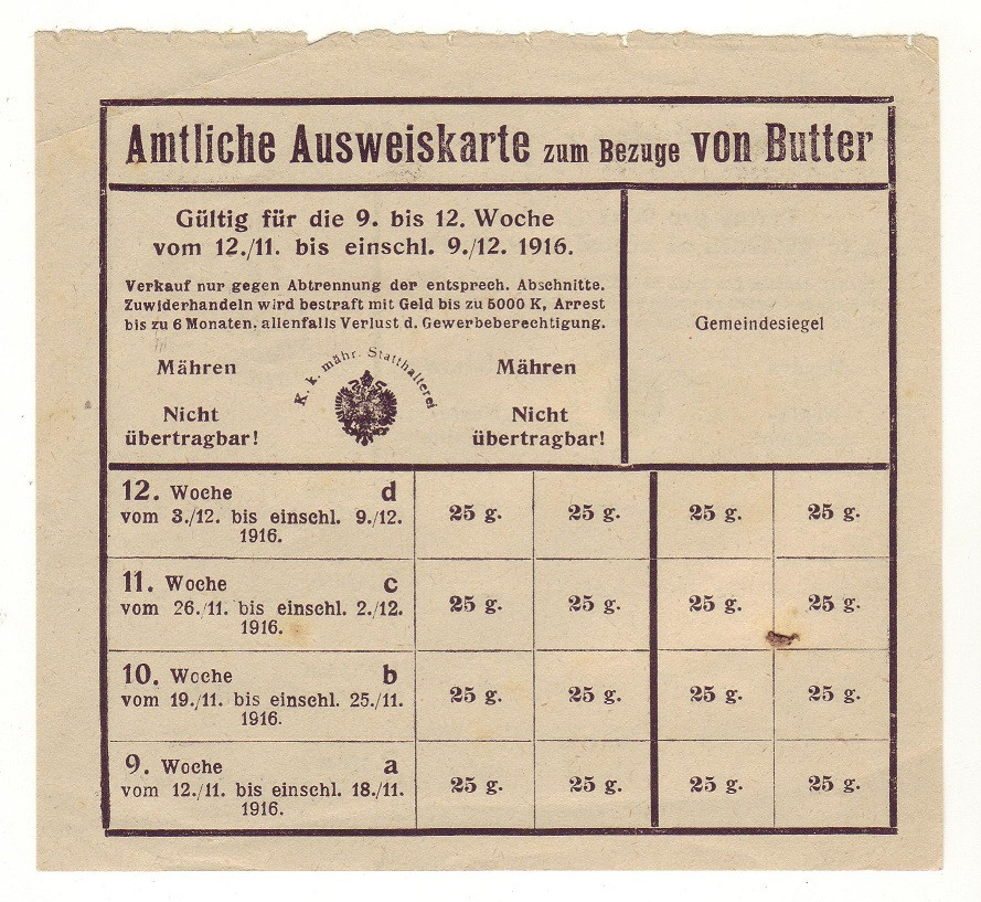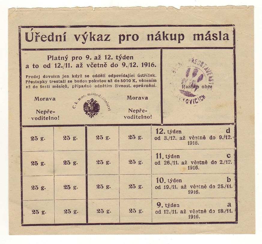 Morava - Úřední výkaz pro nákup másla 9. až 12. týden od 12.11. až 9.12. 1916 , oboustranný česko-německý , Slavkovice